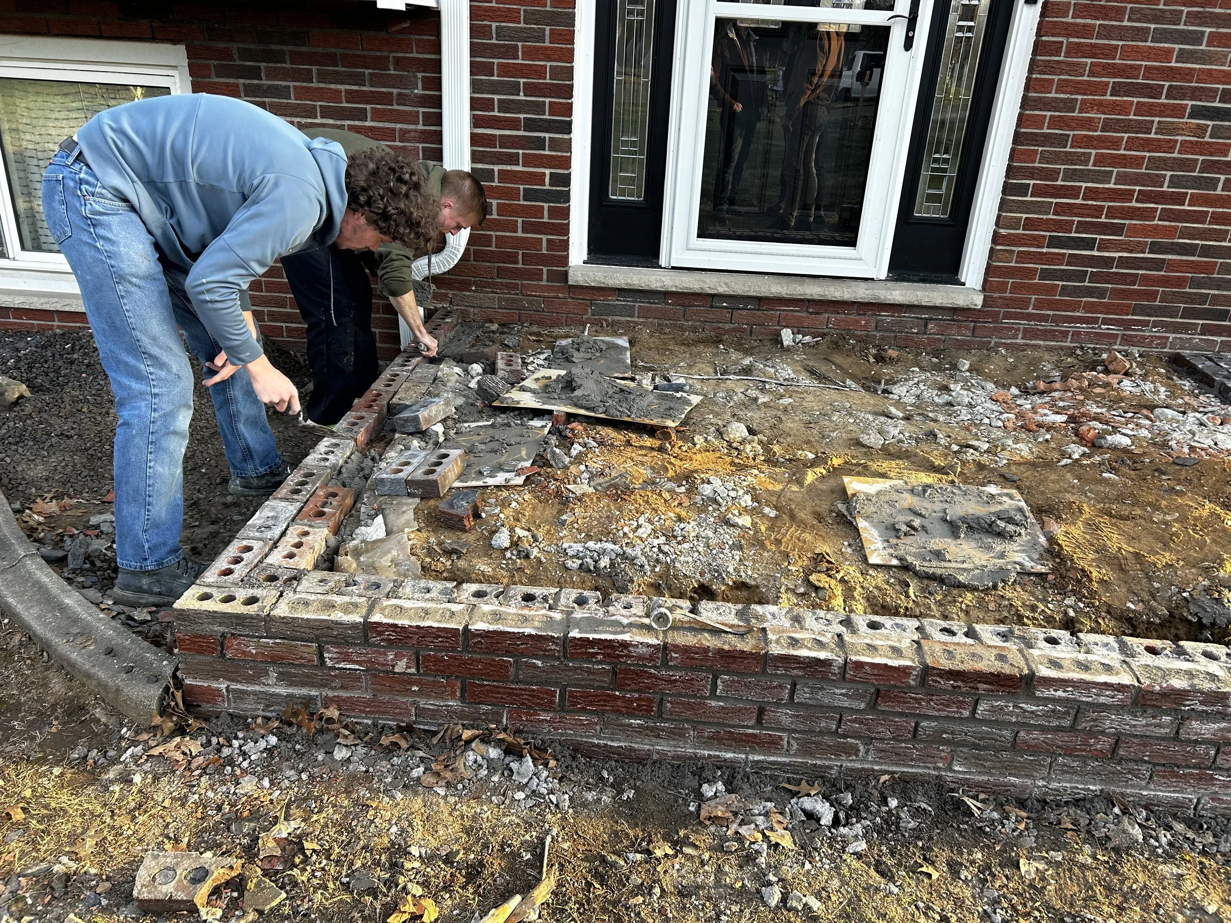 Joey Lee and Joe Hildebrand lay bricks for the College’s recent masonry project sponsored by Otto Baum!